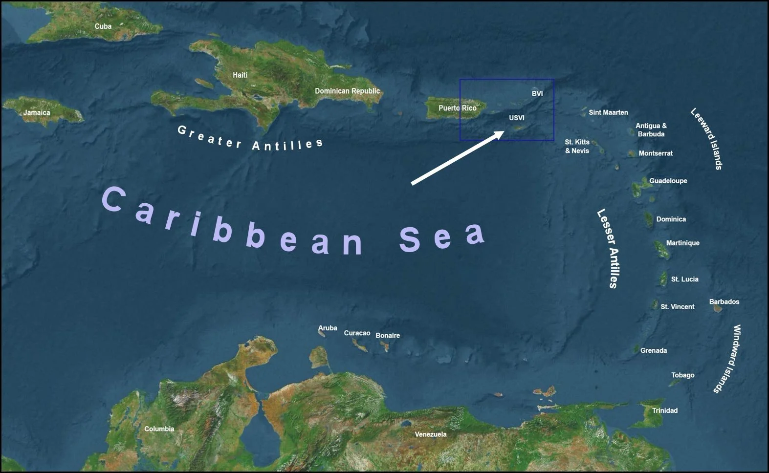 Map of the Caribbean Sea pointing out the location of the US Virgin Islands.