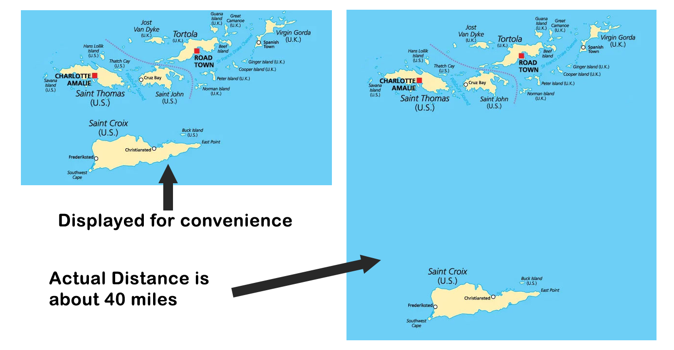 On a clear day there are many places on St Croix with a view of the other Virgin Islands to the north. It is all too often that tourists or potential tourists ask about a ferry for a day-trip to St Thomas, St John, or the British Virgin Islands. This unrealistic goal is likely due to the maps of the US Virgin Islands published in far too many places, including reference books which should be more trusted.